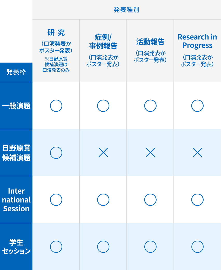 ・原則として、研究の場合は口演発表、症例/事例報告・活動報告はポスター発表となります。口演発表希望者が多く会場の発表枠数を超える場合は、抄録の査読結果に応じて口演・ポスターに振り分けさせていただきます。